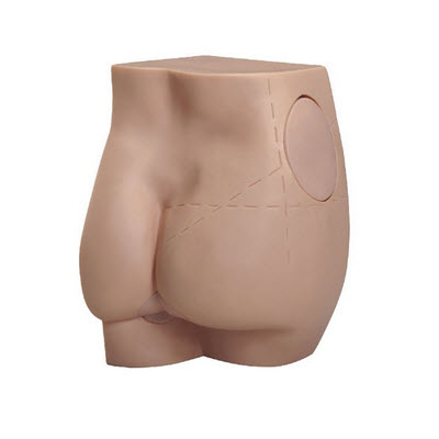 该模型设计简单明了,半边臀部区域内有注射部位区分虚线标志、注射模块组成。注射模块可以注射液体、方便取出、捏干液体,是学员实习的理想产品。