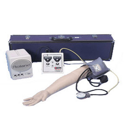人的血压通常很难听诊,以至难以对学生进行评分。而这款臂模型内部装有一扩音器和电子控制单位。指导教师可通过它自行设置心脏收缩和扩张的血压,改变脉搏和音量。另外可添加听诊间歇并区分 5个Korotkoff音。学生可通过释放阀激活血压,并从血压计上直接读取。使用这款血压臂,学生永远不会是“大概”正确 — 对比事先设定值,学生的测量只可能是“对”或“错”。电子控制单位有一个手动的刻度钮可与其他血压计相连。外接扩音器使整个教室的所有学生都能听到原来只有一个人在一支血压计上听诊到的血压。这款模拟器随外接扩音器、电子控制单位(含4节AA电池),一部血压计和一个硬壳提箱供货,但不含听诊器。