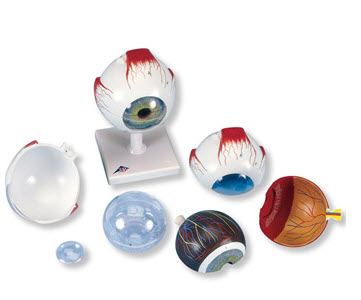 可拆卸部分如下:?实物的5倍,6部分?上半巩膜与角膜和眼附着肌?两半脉络膜与虹膜及视网膜?晶状体?玻璃体置于基架上。