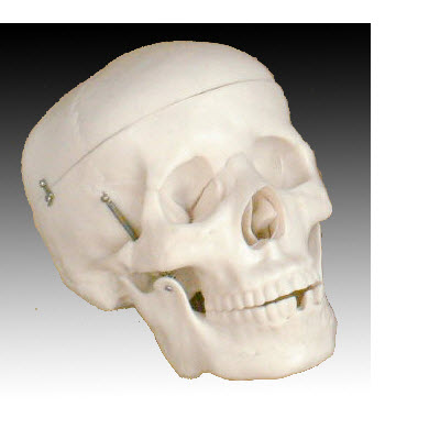 这款经济型自然大成人头骨模型显示:活动下巴、切开的头盖骨、骨缝线和三颗可拆下牙--切齿、尖齿和磨齿。分成三部分。用PVC制成。尺寸:19x15x21CM。