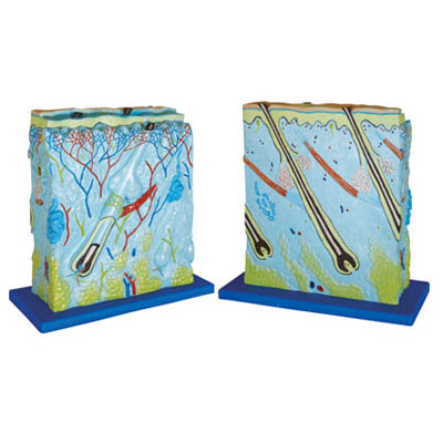 放大105倍的人体皮肤的横截面模型。清晰地显示了三层皮肤、头发毛囊、汗腺、脂肪组织等。不可分割。尺寸: 27x10x31CM。用PVC制成,安放于塑料座上。