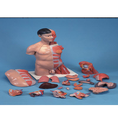 全世界独一无二的的真人大小的模型有6部分可拆卸肌肉臂。因而此高质量模型全面展现了人上体的全面解剖细节。这些详细资料特别适用于高水平的医学院教学。右半部显示皮肤,左半部显示表层和深层肌肉带神经、血管和骨结构。对于内部器官的精细准确的模仿更完善了这款功能齐全且外形美观的模型。下列部分还可拆卸: