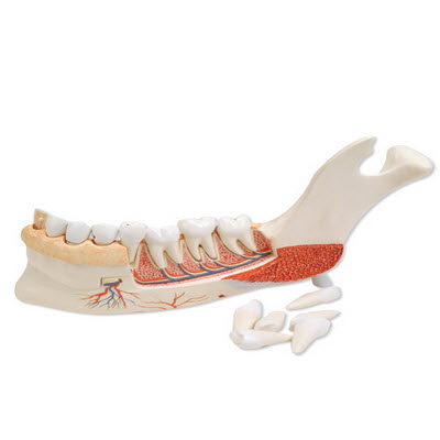 前部的骨可拆卸以展示并单拆各个牙齿。一颗切齿纵切,显示牙内部结构。详细表现外部神经、血管、肌肉、舌下腺和颌下腺。病齿表现的是龋齿的不同阶段,从容易治疗的龋齿到严重的臼齿龋齿,显露牙根。这款模型可帮您解释正确的刷牙方法及其必要性。
