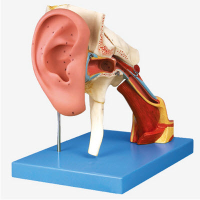 ■ 该模型由耳廓、外耳道、中耳鼓室、鼓膜和听小骨、颞骨岩部、内耳迷路和咽鼓管等8个部件组成,并显示外耳、中耳鼓室、鼓膜和听小骨、咽鼓管、颞骨岩部和内耳迷路等结构,共有58个部位指示标志。