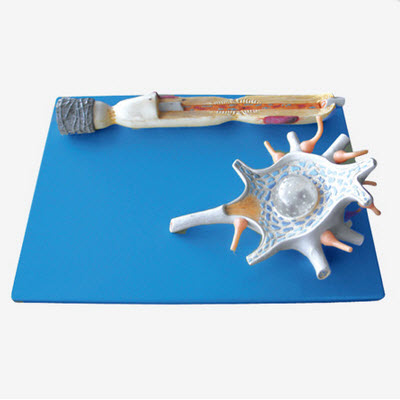 ■ 模型由神经元胞体和神经纤维在电子显微镜下的放大结构两个部件组成,并显示神经细胞轴丘、树突、尼氏体、神经丝、髓鞘板层、雪旺细胞、朗飞结、以及微管等结构,共有15个部位指示标志。