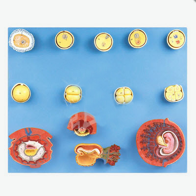 ■该模型由卵细胞受精、开始卵裂、胚泡植入(着床)植入过程、胚盘、23天胚胎、第4周胚胎等13个部件组成,并显示受精与初期胚胎发育过程,从卵细胞开始受精到发育成一个月大小的胚胎等结构,共有69个部位指示标志。