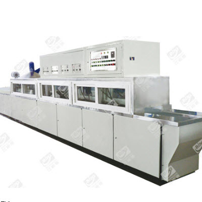 该设备结构紧凑合理,可与前道工序方便衔接,也可独立使用。传动网带采用不锈钢特殊工艺片状网带,使用寿命长。超声清洗采用上下两面辐射工艺,清洗效果更明显。烘道采用热风循环式,温度自控,节约能源。传动采用变频调速,平稳可靠。清洗烘干一次完成,减少生产工序,可直接包装。
