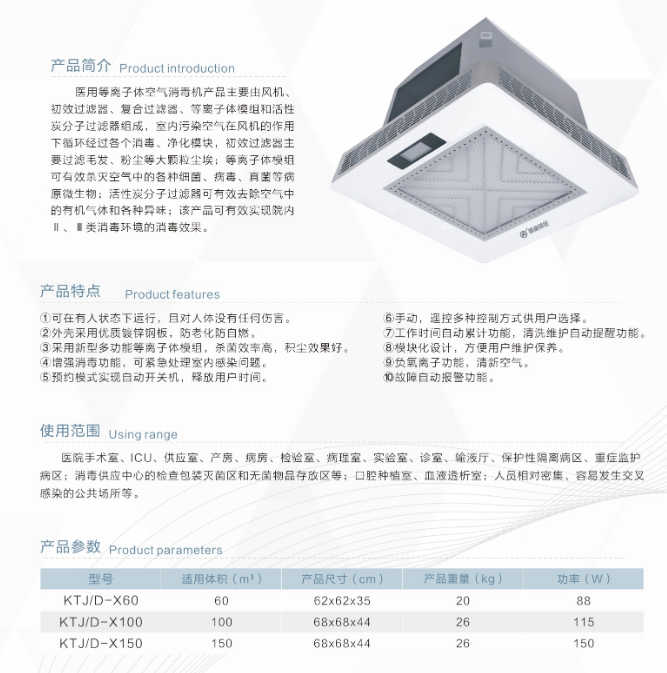 消毒机产品主要由风机、初效过滤器、复合过滤器、等离子体模组和活性炭分子过滤器组成,室内污染空气在风机的作用下循环经过各个消毒、净化模块,初效过滤器主要过滤毛发、粉尘等大颗粒尘埃;等离子体模组可有效杀灭空气中的各种细菌、病毒、真茵等病原微生物;活性炭分子过滤器可有效去除空气中的有机气体和各种异味;该产品可有效实现院内l、Ⅲ类消青环境的消毒效果。