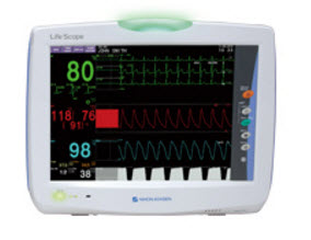 该产品可设置在患者附近,除了在画面上显示患者的生命体征信号(心电、呼吸、血压、体温、脉搏血氧饱和度、CO、CO2)及发出报警外,还可进行呼吸暂停检测、心律不齐的监护。选配了测量装置/单元时还可进行麻醉气体(GF-210R/GF-220R)、Flow/Paw(GF-220R)、BIS(QE-910P)和脑电(AE-918P)的测定。该产品与其他公司制外部设备连接时可显示TOF、通气量、CCO、tcPO2、tcPCO2的信息。该产品可在医院的手术室、术后恢复室、普通病房、ICU、CCU、HCU、NICU、门诊急救以及一般开业医生使用于成人、小儿(含婴儿)和新生儿的临床。另外,该产品也可以使用电池工作,可供医院内外患者移动时监护用。