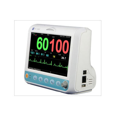 本监护仪适用于成人,儿童和新生儿,可以监护心电(ECG)、无创血压NIBP、血氧饱和度(SpO2)、呼吸(RESP)、体温(TEMP),同时可显示4道波形和所有监护参数的信息。
