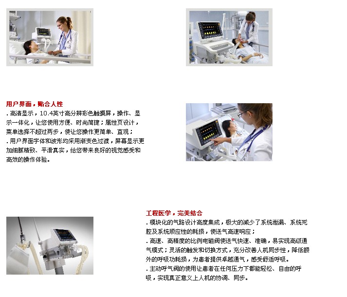 . 整体机身紧凑、时尚,主机与压缩机分离,便于呼吸机安装在吊塔上,节约临床工作的空间;