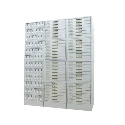 说明:一组4节,每节6抽,每组配一个底座,每个抽屉可存放标准塑料包埋盒蜡块约600块,每组可存放约15000块。柜体采用优质冷轧板加工成型,柜体表面处理脱脂除油、表调,锌系磷化、钝化、静电粉末喷塑。