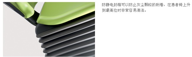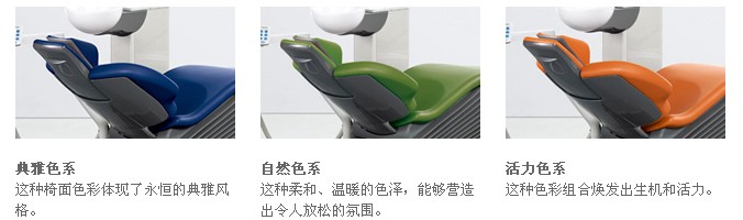 无论用户的诊室采用了何种装修风格(经典型/典雅型、天然型/和谐型、庄重型/活泼型),口腔综合治疗台的椅垫和漆面颜色都能与用户诊所的装修氛围谐调一致,营造出令患者与工作团队都感觉良好的氛围