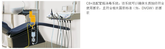 C8+ 将久经考验的技术和经典设计集于一身:符合人体工程学且十分舒适的患者身体定位(ErgoMotion)、高品质的材料、直观的用户界面和可靠的卫生消毒功能。在全世界范围内,已经有尽40,000 台C8+口腔综合治疗台在使用。