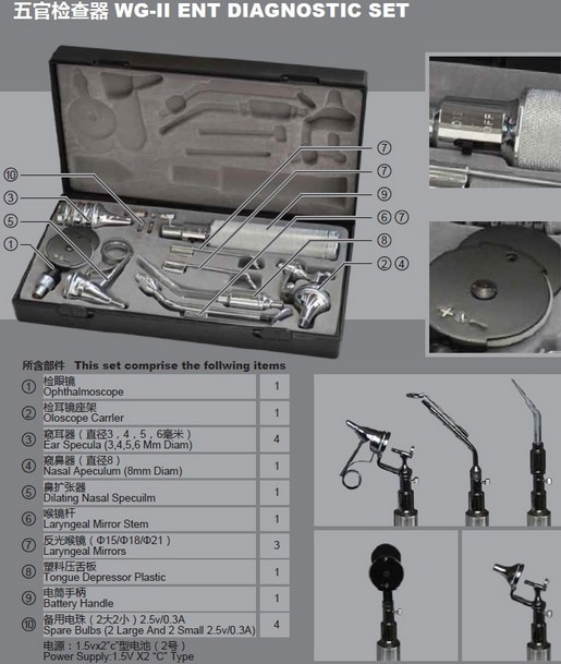 ●五官检查器供医生检查眼底、耳腔、鼻腔、口腔、咽喉部之用。