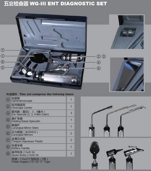 ●五官检查器供医生检查眼底、耳腔、鼻腔、口腔、咽喉部之用。
