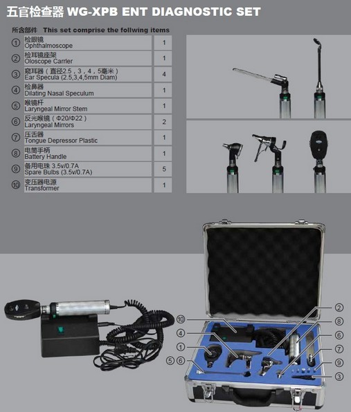 ●五官检查器供医生检查眼底、耳腔、鼻腔、口腔、咽喉部之用。
