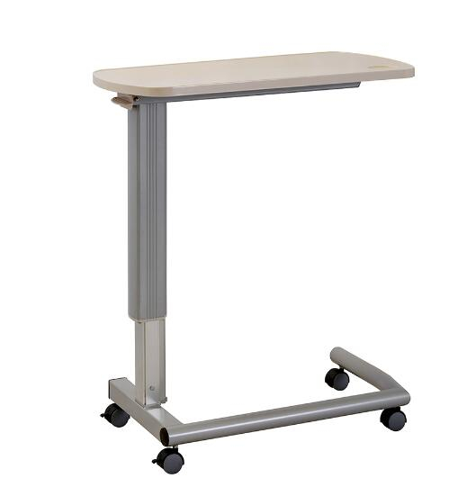 3、餐桌板采用抗倍特板,餐桌面表面光滑,经久耐用,桌面采用气弹簧上下升降调节,轻松省力,单手即可操作;铝合金型材立柱,自然时效后氧化处理,耐腐蚀,抗菌易清洁;底架采用碳钢喷涂,“U”形结构,放置稳定不会倾倒,使用时底架伸进床底,立柱贴近病床,餐桌面刚好位于病床中部,使用十分方便。