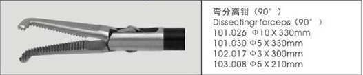 该医用微创弯分离钳,包括固定手柄和活动手柄,它们之间通过螺栓转动连接,其特征是,还包括有拉杆槽、转轮、钳杆座、转轮轴、转轮轴套、固定板、固定套、轴承、钳杆、拉杆、拉杆座、钳夹、钳头座、绝缘套和旋转套。本实用新型结构设计合理,能对人体体内组织器官和病灶进行分离,手术创面小,伤口愈合快,手术使用方便安全