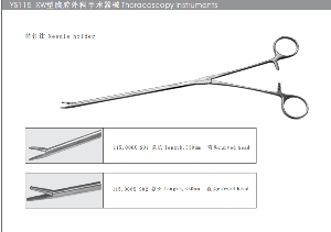 持针钳,属于医疗设备技术领域。本实用新型解决了现有持针钳的钳头销轴易断裂、缝针易变形的问题,包括固定钳头,固定钳头与外管固定连接,外管后端与套筒装置相连,套筒装置后端深入到固定手柄内,套筒装置的后部设置有密封圈,固定手柄前端上部还设置有冲洗接头,固定手柄前端设置有与其相铰接的活动手柄,固定手柄和活动手柄之间设置有锁扣,活动手柄的前端与连接片的一端铰接,连接片另一端铰接在连接块上,连接块的后端设置有弹簧,连接块的前端与拉杆连接组件相连,拉杆连接组件前端设置有拉杆,拉杆与活动钳头通过销轴铰接,活动钳头与固定钳头铰接。本实用新型主要运用于微创手术的场所。
