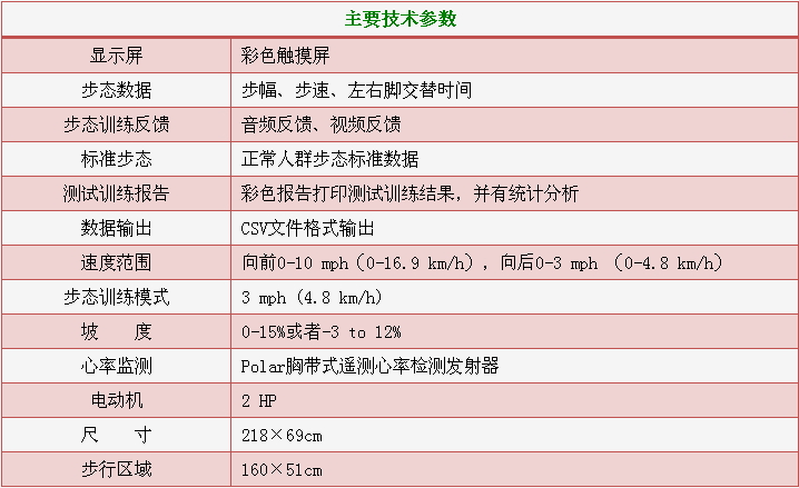 本产品可以促进初期无明显病征的患者迈出正确的步态,达到矫正的目的,透过缓慢的开始(从零的启动速度和小步循环速度慢慢增加),可以手动调整患者的下肢来达到期望的步态模式,这样在早期的恢复过程里就能适度加强技巧来训练患者。当患者慢慢进步时,正确的步态长度会结合正确的步态循环。当跑步带的速度增加时,患者就必须步行更久或持续朝目标前进。临床医师可以将标准数据与患者的恢复进度当作基准。本跑台的坡度调整范围可从-3%到12%,不同的坡度对背痛、姿势不良、腰椎和髌骨病变的患者的矫正与康复非常适合。