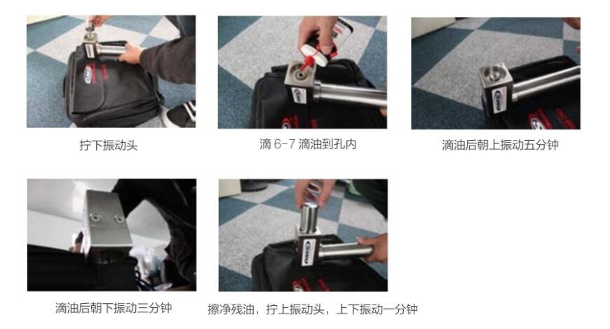 5、使用时,如听到有杂音或者仪器有点顿,这时应该停止使用,需滴加润滑油。一般每隔一周滴加油(把振动头拧下,滴6-7滴油在孔内),滴油后朝上振动五分钟,滴油后朝下振动三分钟,擦净残油,拧上振动头,上下振动一分钟。 (如下图)