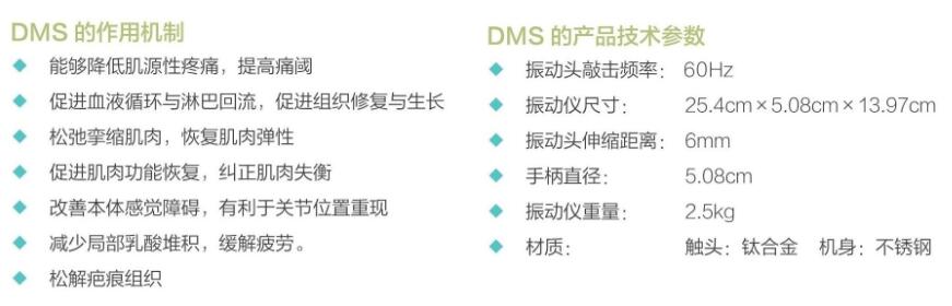 DMS电动肌肉振动仪产生快速连续的振动和打击,会影响机械感受器的功能,从而抑制了疼痛,放松痉挛肌肉,控制脊柱关节恢复正常活动。和按压技术一样,DMS可以减少肌肉,肌腱,骨膜,韧带以及皮肤上的扳机点敏感度。肌肉及软组织是通过深层和浅表的筋膜,有粘性的润滑液以及大大小小的血管连起来的。代谢物及毒素会在这些连结的组织中积存,而DMS可以提高血管舒张,使得组织获得足够的新鲜氧气及营养。这一过程会移除那些废料从而帮助组织修复。DMS可以在肿胀关节之上非常轻微地使用,目的是将炎症产物分解并通过血液排除。