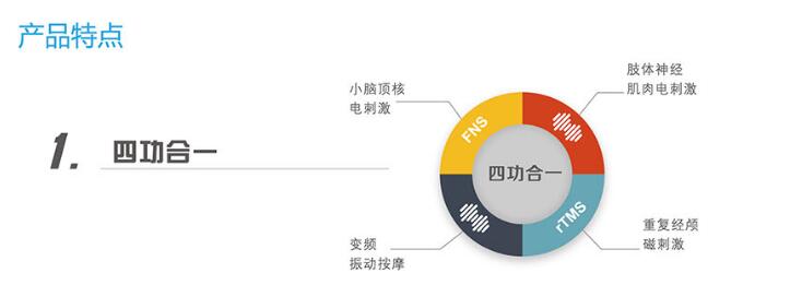 1、便携式机型,具有两组输出,主极和辅极输出,主极采用脑电仿生低频电输出治疗头部,辅极采用低频调制中频电输出治疗肢体。
