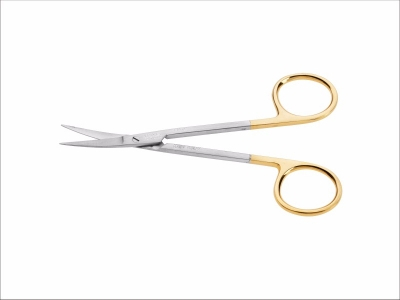 用于剪切眼内组织,特点:一剪刀片刃口镶有高强度硬质合金片处理,一剪刀刃口开齿,使得剪刀在使用过程中咬切更快速,咬合力更强劲,指圈镀金色标示。