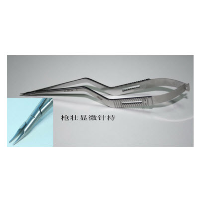 枪状显微针持, 扁平弹簧手柄。平头钳口,用于夹持7个0以下的微型针。