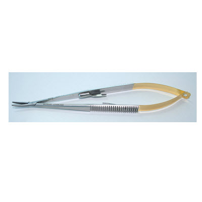 用于显微手术。钳头镶钨碳钢垫片,夹针牢,使用寿命长,手柄带弹簧锁扣。
