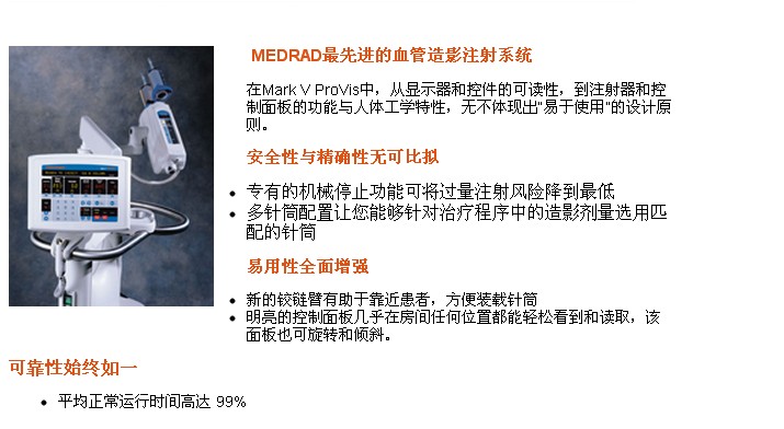 Mark V ProVis 不仅继承了 MEDRAD Mark 系列产品的良好声誉,还增加了一组可供选择的增强功能。 Mark V ProVis 同样具备 MEDRAD 专有的机械停止功能,能够自动设置和锁定,以物理方式限制注射所选剂量。