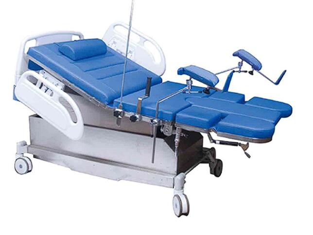 床下装有污物盆,并装有脱卸式辅助台,根据临床的需要进行变换;两侧的搁脚架,变位式扶手为助产时使用。
