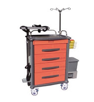 备注:整体ABS工程塑料台面,凹陷设计,嵌软玻璃;四柱为铝合金,三中抽,一大抽,内置分格片,可自由分格;三折静音轨道、脚踩式污物桶、锐器盒,升降式输液架带锁紧螺头,除颤器平台(选配),氧气瓶支架,除颤板,T型挂钩,电源,中控锁或一次性锁,静音脚轮,两个带刹;车体标识牌插片,抽屉标识牌插片。