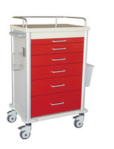 备注:优质不锈钢及铝合金材质、五抽、一抽盘、台面米黄、抽屉果绿或红、药格、一方桶、一消毒瓶架、一抢救板。(选用优质静音轮、静音伸缩导轨、并可根据客户的需求更改颜色、尺寸或配置)