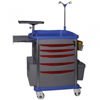 抢救车,包括车体及放置在车体上的医用橱柜,医用橱柜包括柜体和箱盖,柜体的上部为用来放置药品的空格,柜体设有用来封闭空格的推拉盖板,车体上设有用来固定氧气瓶的氧气瓶套筒,车体的***端设有输液架,在***辆抢救车上同时安装有输液架以及氧气瓶套筒,并设置有多个用来放置物品的抽屉、橱柜,可以盛放的物品比较多,使用起来比较方便,推拉盖板***方面可以作为盖板使用,同时又可以作为操作台使用,增大了操作的面积。