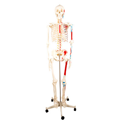 这款经济型的、真人大小的、关节相连的人体骨骼模型是基础解剖教学的理想模型,物美价廉。手臂和腿部可拆下供研究。显示神经分支、脊椎动脉和腰椎间盘等。整体模型在人体全身骨骼模型的基础上的半边进行肌肉附着点着色。