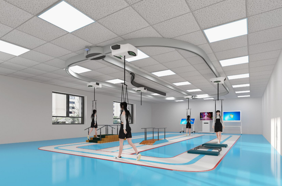 动态自适应天轨康复系统,是根据步行分析、减重训练和自适应控制等理论,运用AI智能算法,通过智能化软件系统驱动控制和数个智能感应模块控制运行,将人工智能技术实时反馈到实际运动康复训练中,多种训练模式和多轨道及变轨数种训练路径,因人而异方便医生开具不同训练方法,整体模拟日常生活场景训练,真实地让康复患者获得整体优化的康复训练场景和体验感,通过运动再学习的方式帮助患者恢复自身的肌力状态实现较好步行能力,并能将患者的跌倒风险和康复治疗师的工作强度降到较低。