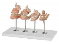 XM-913牙与颌骨的发育模型由从乳牙至恒牙萌出的不同发育阶段共4个模型(出生后不足6个月、出生后2岁左右、出生后5-7岁、出生后17-26岁)组成,每个模型由左侧上、下颌骨两个部件组成,并显示乳牙萌出、换牙、恒牙萌出等不同发育阶段以上、下颌骨和上颌窦发育过程等结构,共有出生后2岁左右10个部位、出生后5-7岁8个部位以及出生后17-26岁8个部位指示。