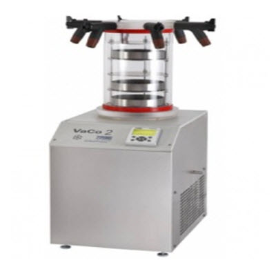 VaCo 2型实验室冻干机主要部件为:微处理器控制的捕冰冷凝器;触摸屏;真空和温度测量装置;自动冻干程序;有机玻璃干燥箱、干燥搁板、惰性内支架;带6个连接头和真空阀及与干燥箱体顶部固定基座的不锈钢歧管(连接圆形烧瓶和安瓿瓶适配器等);可选16个安瓿瓶适配器;可选液氮冷却(可至–150°C)等