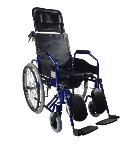 铝合金车架,表面金属烤漆处理,高靠背、可躺式,可拆皮革加长扶手,带抽式座便装置、方形便桶,可拆脚踏,脚踏可升降180度,带腿托,ABS手圈、踏板,8"胖前轮,24"后轮,附安全带。