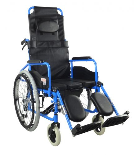 钢制车架,表面喷塑处理,高靠背,高档可躺式升降装置,皮革座背垫,高档座便装置,方形马桶、可拆长扶手,ABS手圈、脚踏,脚踏可拆卸、带腿垫、脚踏可升降,8"胖前轮,24"后轮。