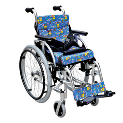 儿童型铝合金轮椅,适合7-14岁儿童使用,车架采用铝合金车架,表面采用阳极氧化处理,单马扎,配6cm的厚海绵防滑透气软垫和3CM靠背垫,可拆卸。扶手可后翻,高度可5档调节,高强度铝合金踏板、前叉,腿靠为铝合金型可快拆,前轮为6寸实心胎,后轮为22寸灰色充气胎,可快拆。