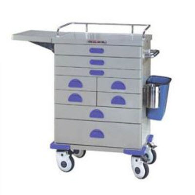 多层设计设计,上部三层抽屉,内置药盒,下部4小两大抽屉,可放置各种麻醉药品。一侧放置一个塑料污物桶。