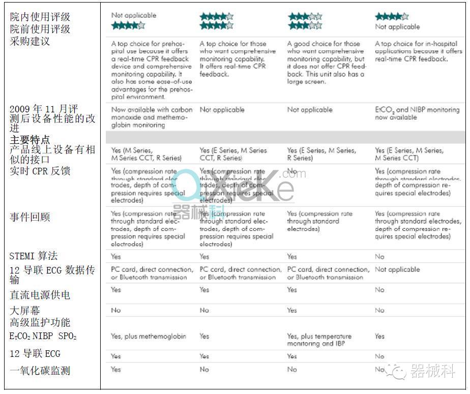 *测试结果概要:市场上几乎所有的除颤仪均能满足用户的需求。我们着重于推介拥有CPR反馈功能和/或可称它为-高级监测功能。我们对Physio-control Lifepak15在院内使用和院前使用均作出了3星(满分为5星)的评价。它方便使用,显示屏幕大,在两种使用场合都是个好选择。它的评价低于其它部分型号,原因是Lifepak15不具备实时CPR反馈功能,但它却能从事件回顾中收集CPR数据。 有2个型号的设备无论在院内、院前使用都获得了4星的评价。它们是Philips HeartStart MRx和Zoll M系列。另外,Zoll E系列在院前使用评测为4星,Zoll R系列在院内使用为4星。