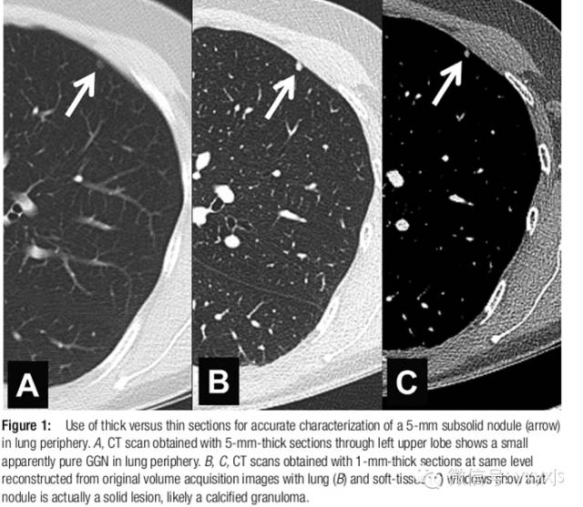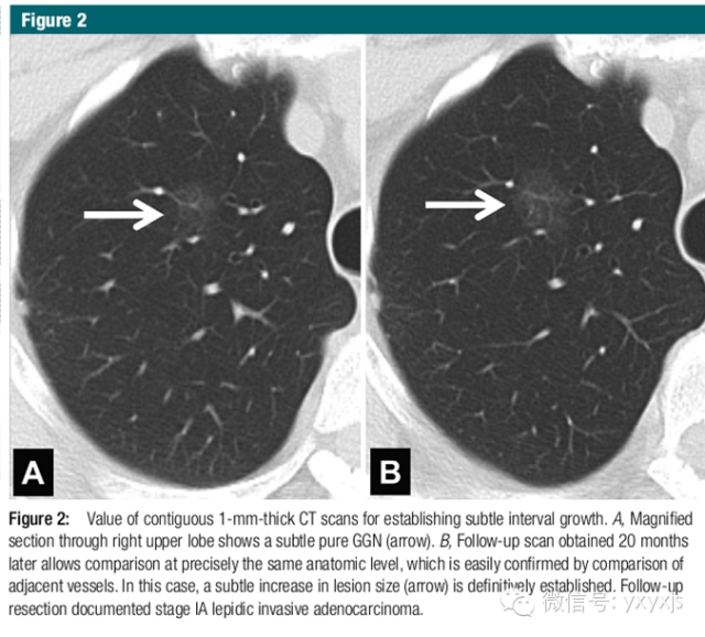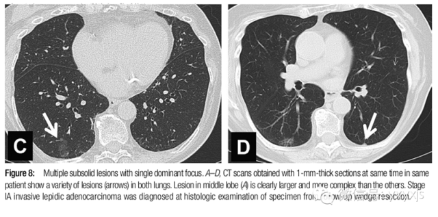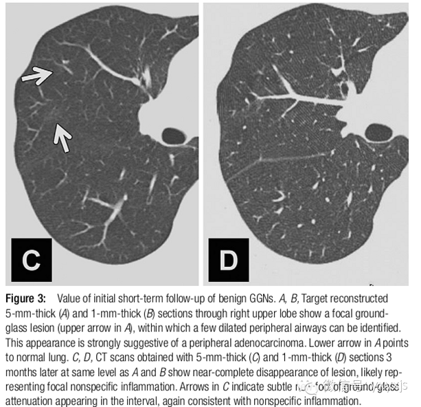 尤其是年老者,因为其在病理上代表AAH,少数为原位腺癌。扫描层厚必须为1mm以确定其是否为真正的GGO。
