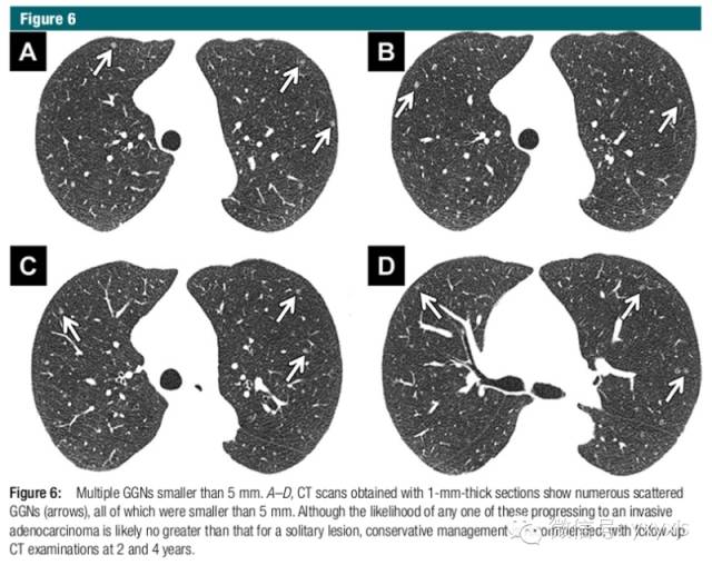 4 多发小于5mm的边缘清晰的GGO,应采取比较保守的方案,建议2年及4年后随诊。