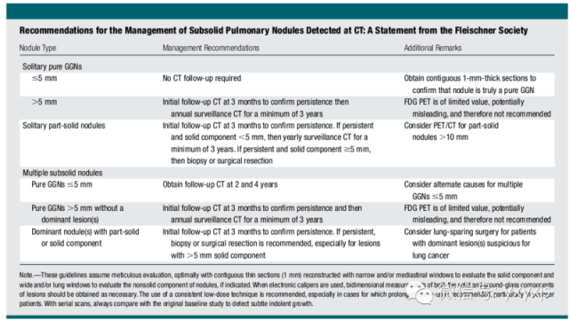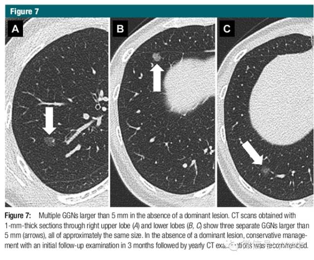 2 孤立的、直径大于5mm的纯GGO,3月后复查,以观察病变是否消失。如持续存在,则每年复查,至少持续3年。