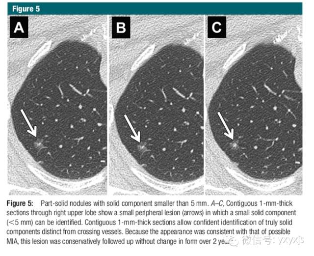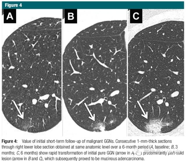 3 孤立的部分实性密度GGO,特别是实性成分大于5mm者,3月后复查,发现病变增大或无变化时,应考虑恶性病变可能。