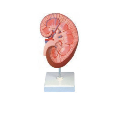 1.该模型显示右肾剖面的肾皮质、肾髓质、肾小盏、肾大盏、肾盂、输导管以及肾动脉、肾静脉等结构。